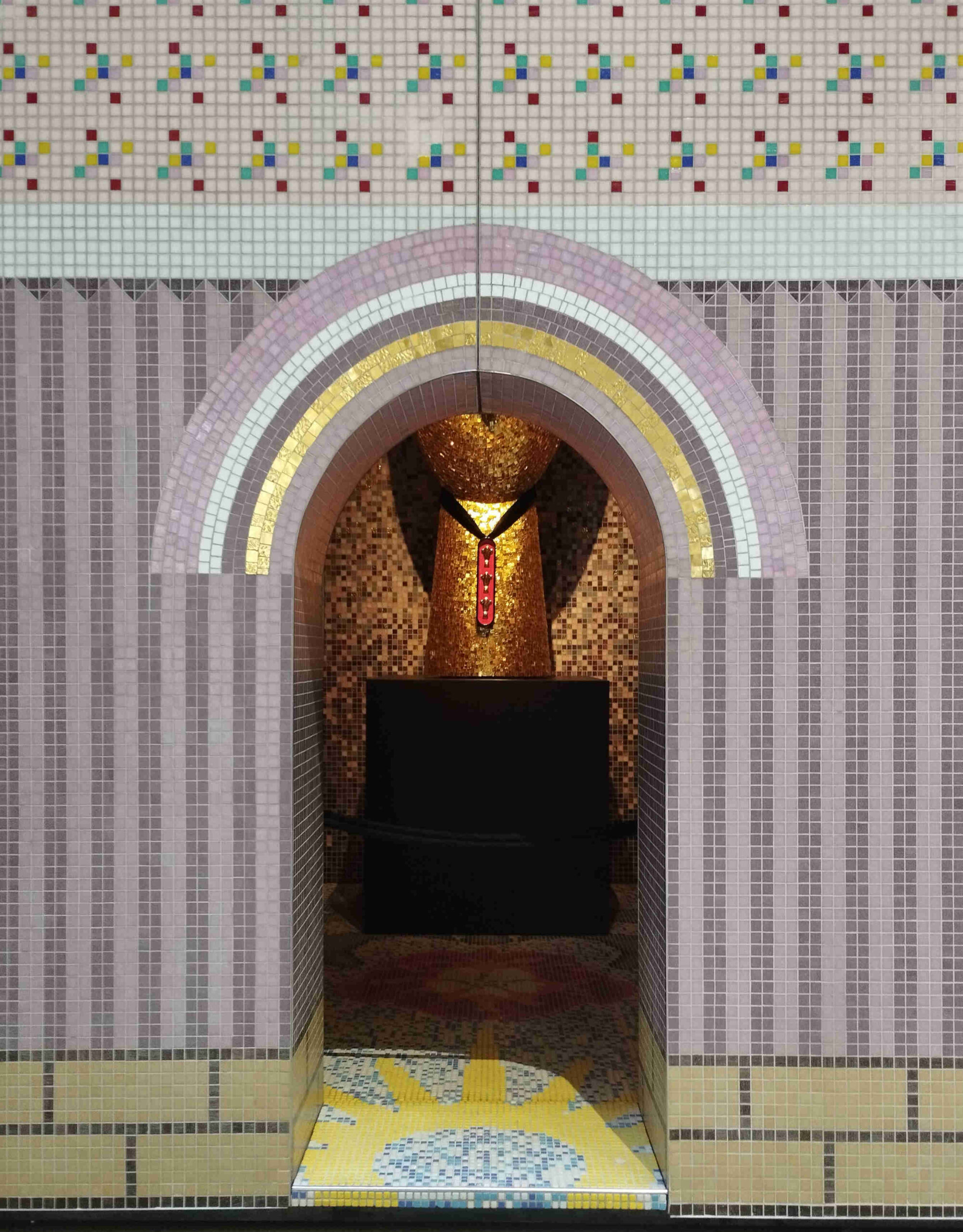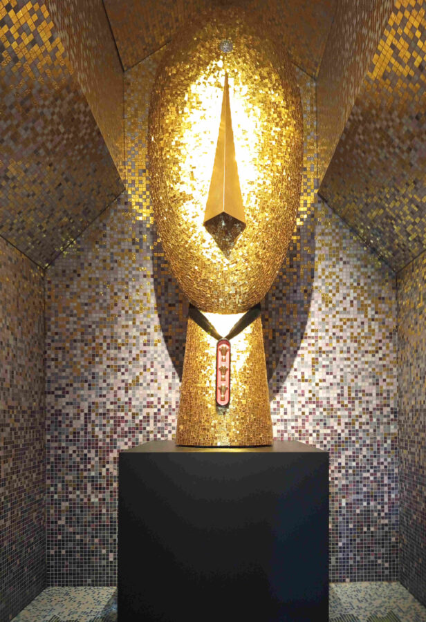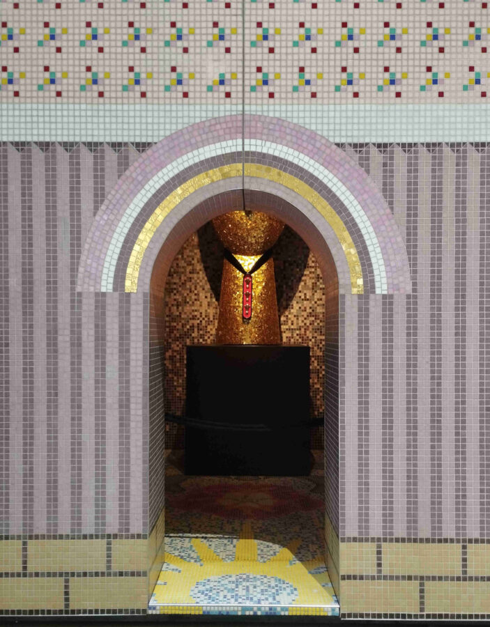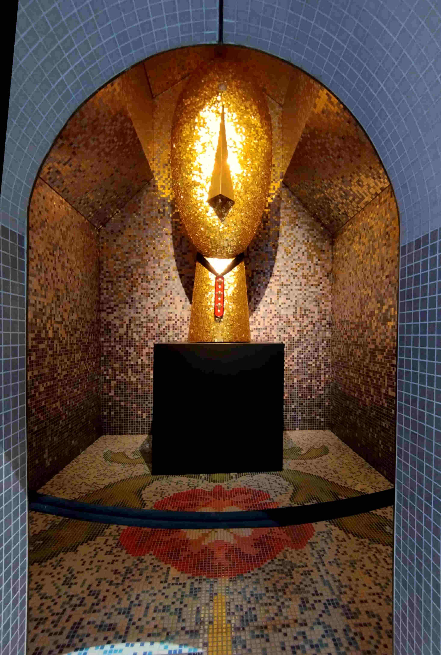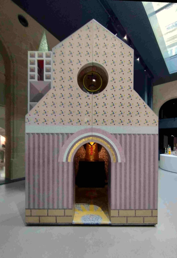 Alessandro Mendini réuni dans Petite cathédrale, l’ensemble des aspects – architecture, statuaire, objets de superstition, lumière, musique, parfum – constitutifs du folklore religieux auquel le grand public peut être sensible.