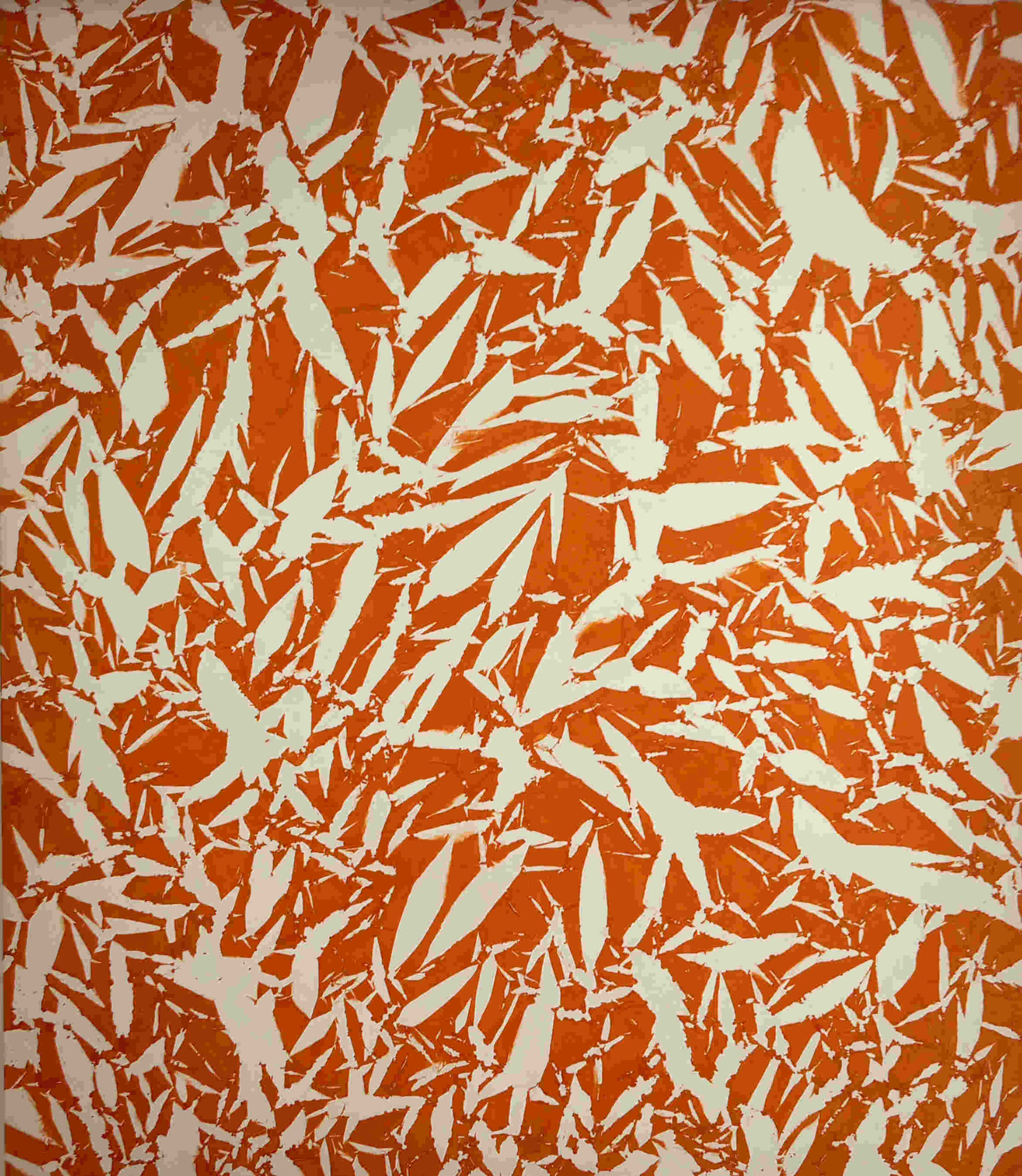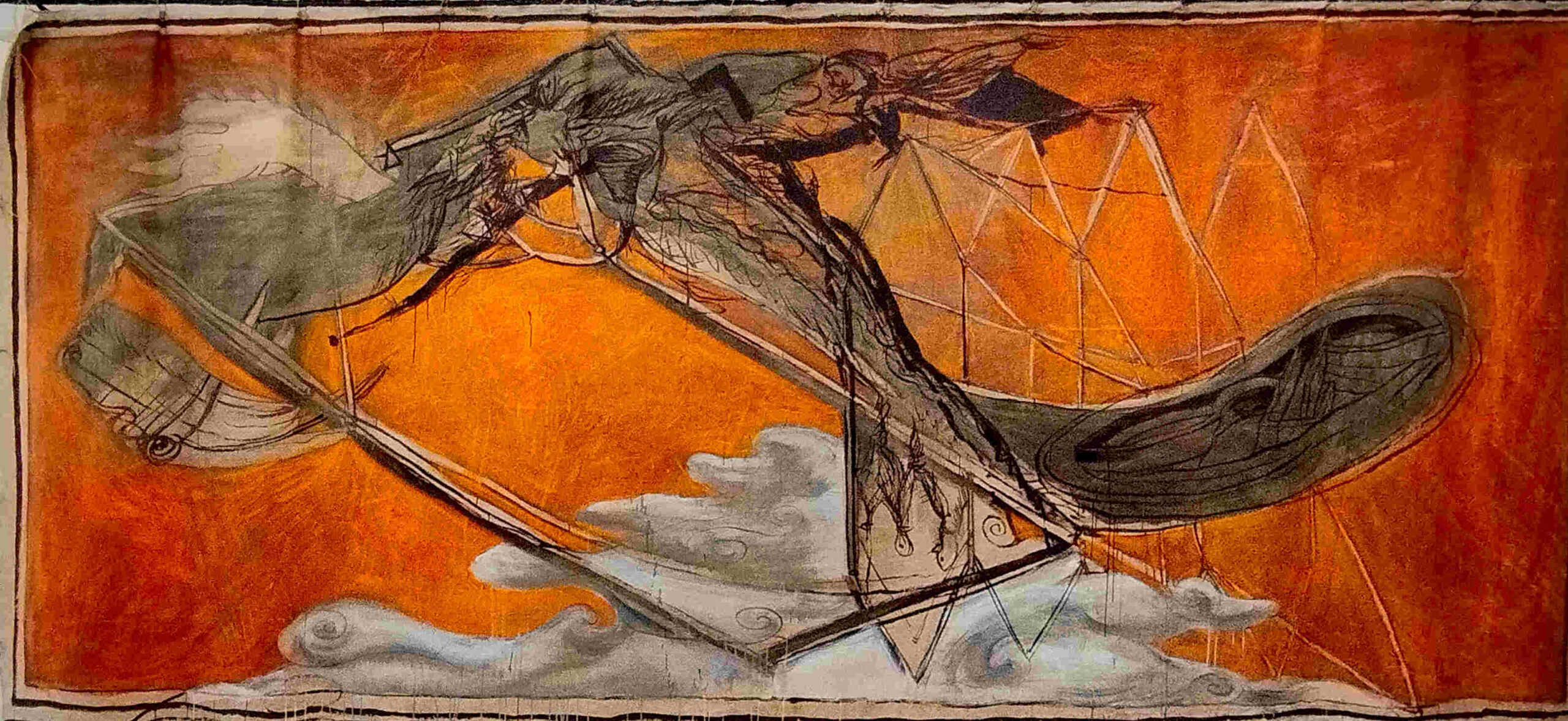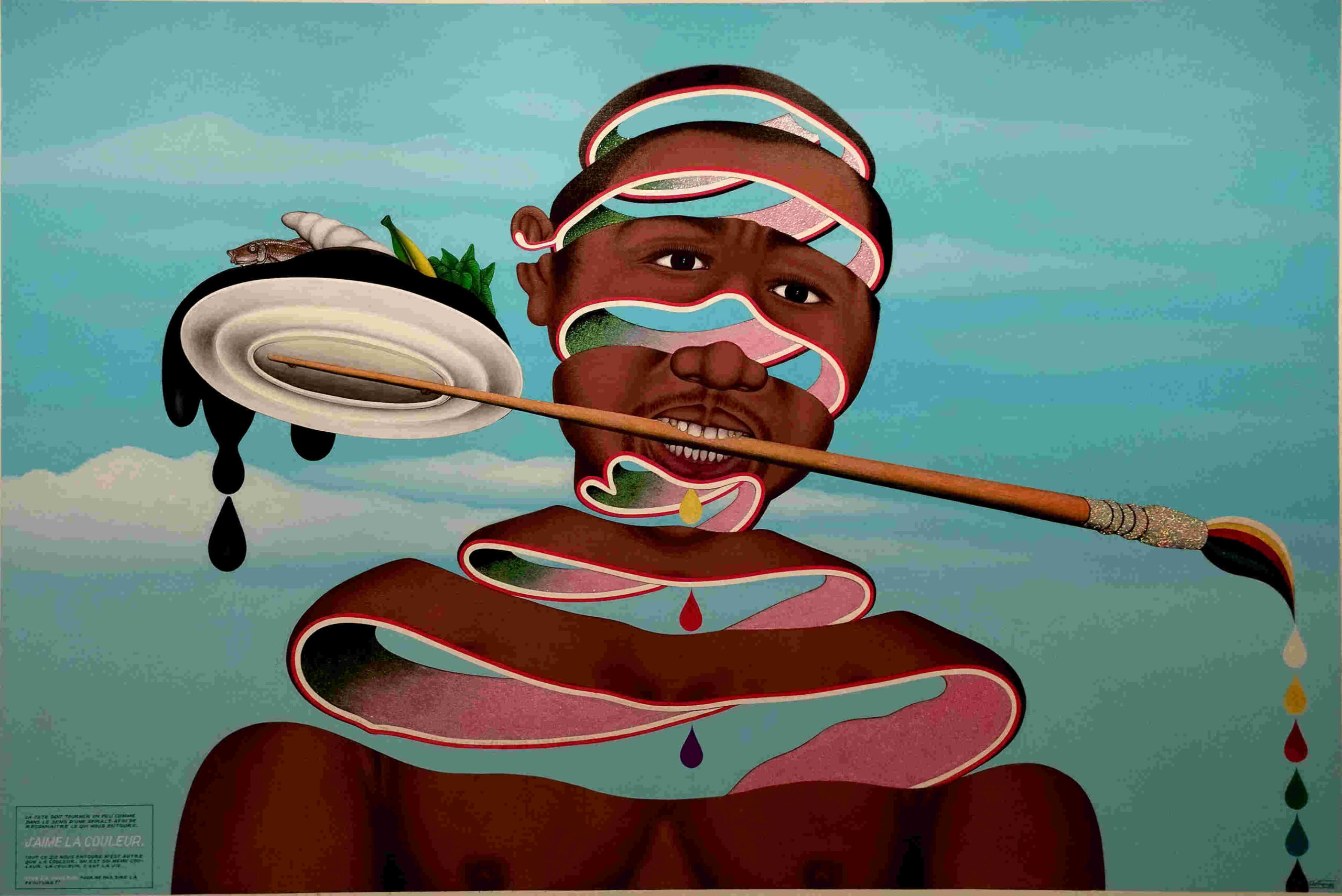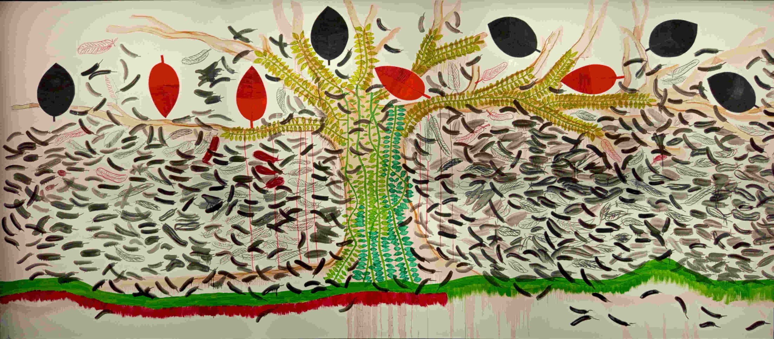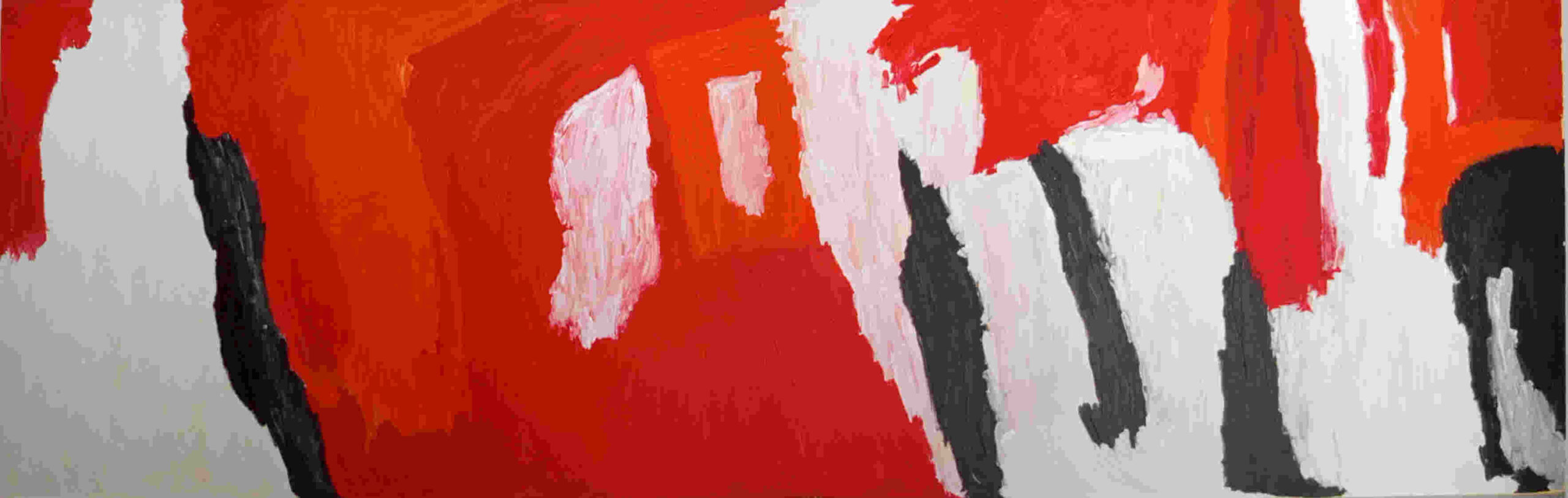 Dans un style abstrait fait de larges aplats de couleurs rouge, noir, blanc, elle transcrit magnifiquement le souvenir de son pays.