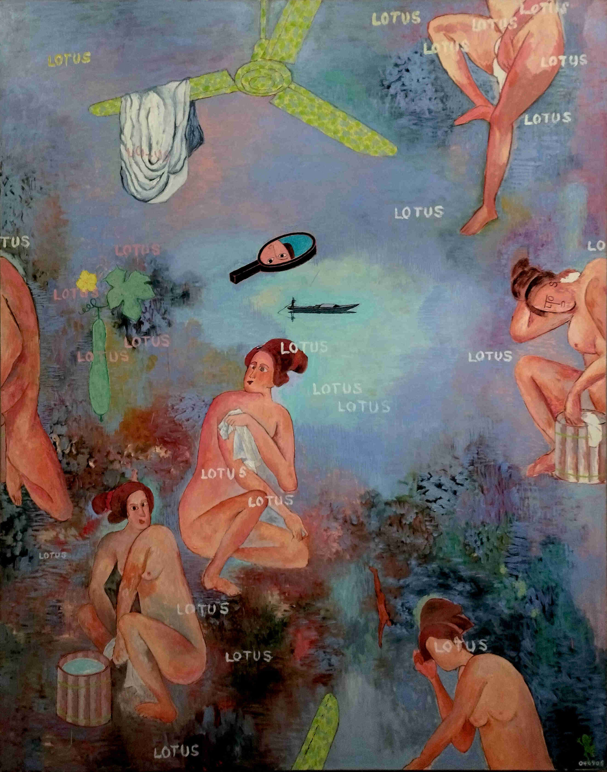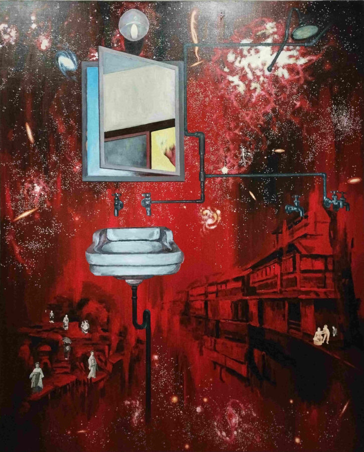 Dans deux toiles de grandes dimensions, Tanadori Yokoo immerge le visiteur dans des espaces colorés d’une seule tonalité, rouge pour l’un, bleu pour l’autre, dans lesquels il insèrent des personnages de geishas en quasi lévitation.