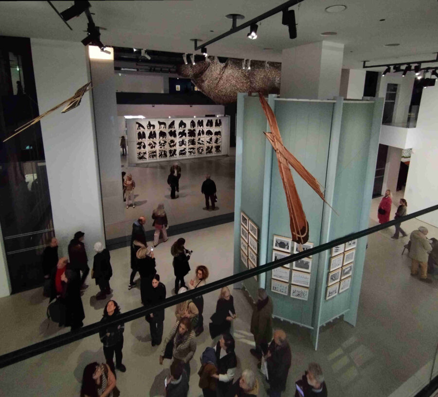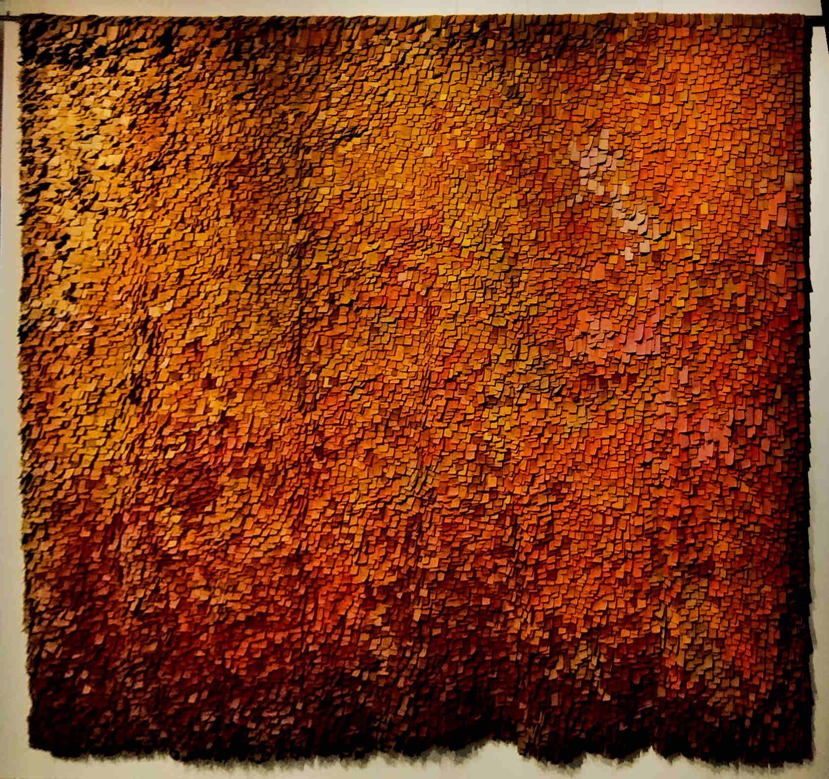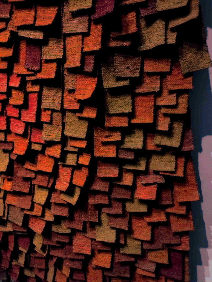 C’est une pièce monumentale de 7m par 8m, composée de bandes tissées — laine et crin de cheval cousues minutieusement — qui transforment le textile en une sorte de mur tissé, conférant au panneau une dimension sculpturale voire architecturale.