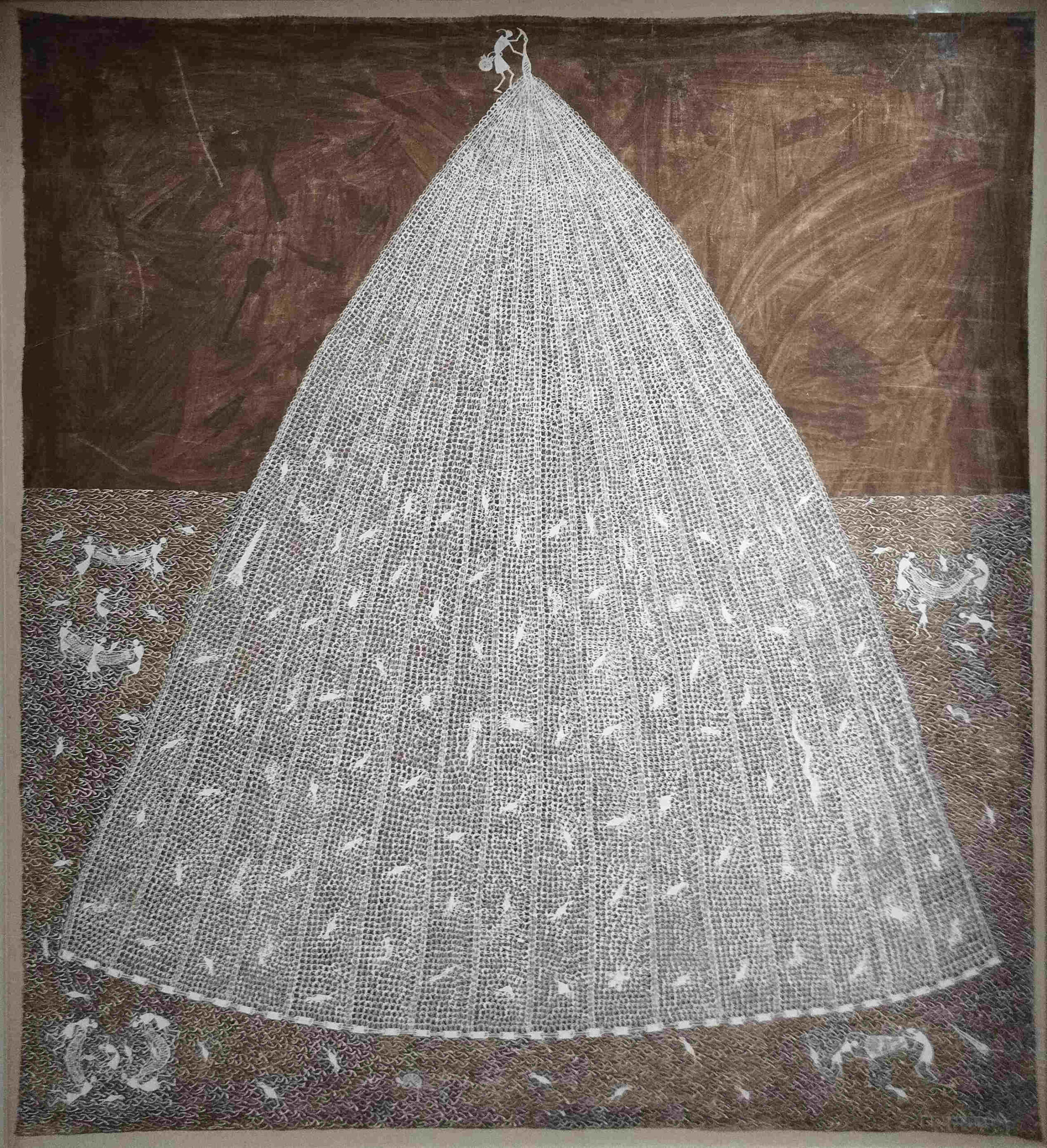 L’artiste aborigène Sally Gabori (Mirdidingkingathi Juwarnda) représente dans son grand panneau, Dibirdibi Courntry, son île d’origine dont elle fut chassée.