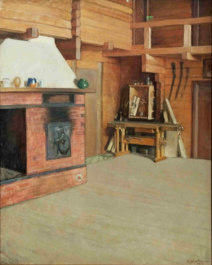Après avoir longé quelques tableaux représentant les versants enneigés du lac de Tuusula, le visiteur franchit un seuil et pénètre dans une vaste pièce aux murs habillés de bois rouge.
