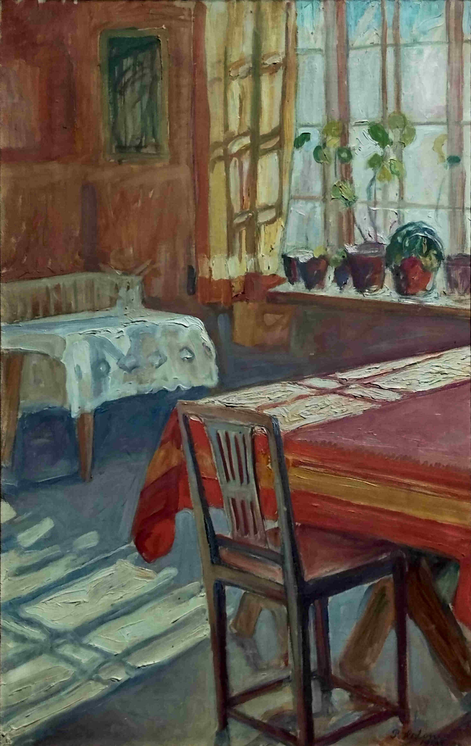 Après avoir longé quelques tableaux représentant les versants enneigés du lac de Tuusula, le visiteur franchit un seuil et pénètre dans une vaste pièce aux murs habillés de bois rouge.