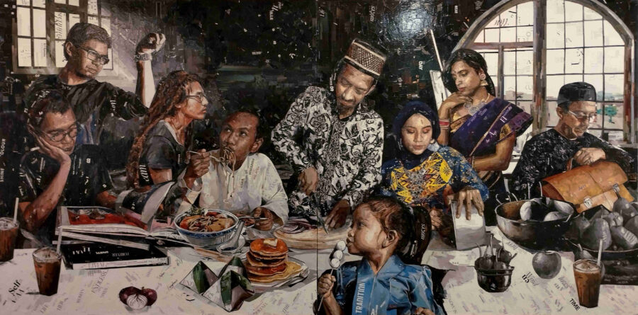 Dans Berhidang Tamu de 2023, Anisa Abdullah témoigne au travers de collages dynamiques et colorés, de la multiethnicité de la Malaisie.
